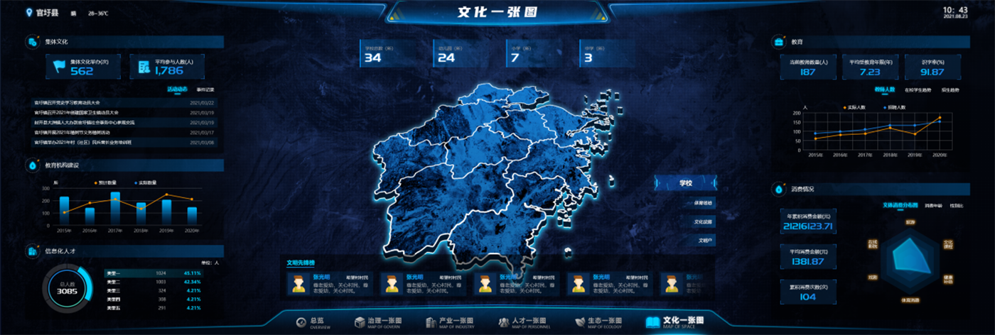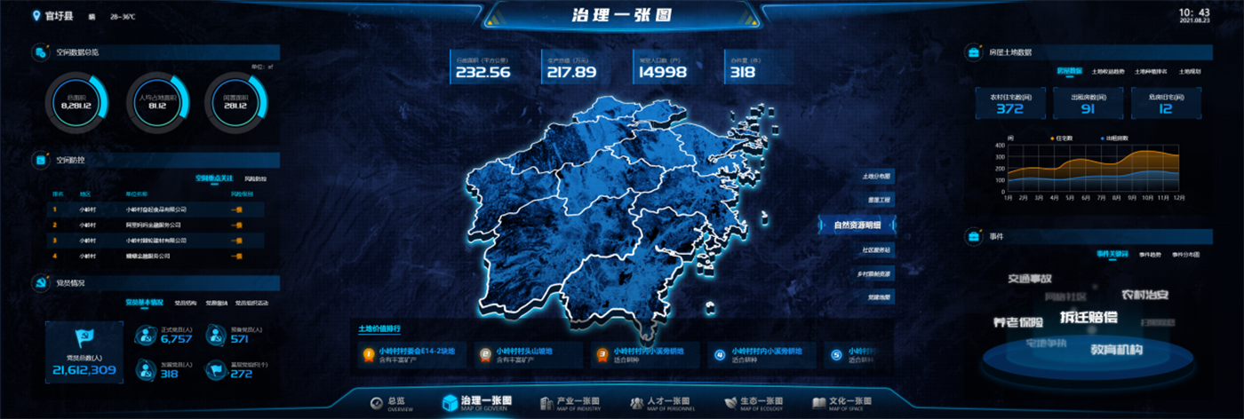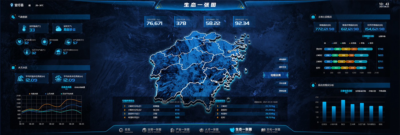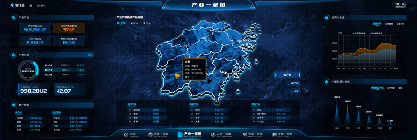 Leadership Cockpit: three-dimensional visual management, large screen display, overview of rural revitalization index (rural industry index, rural ecological index, etc.), featured agriculture special and targeted poverty alleviation special